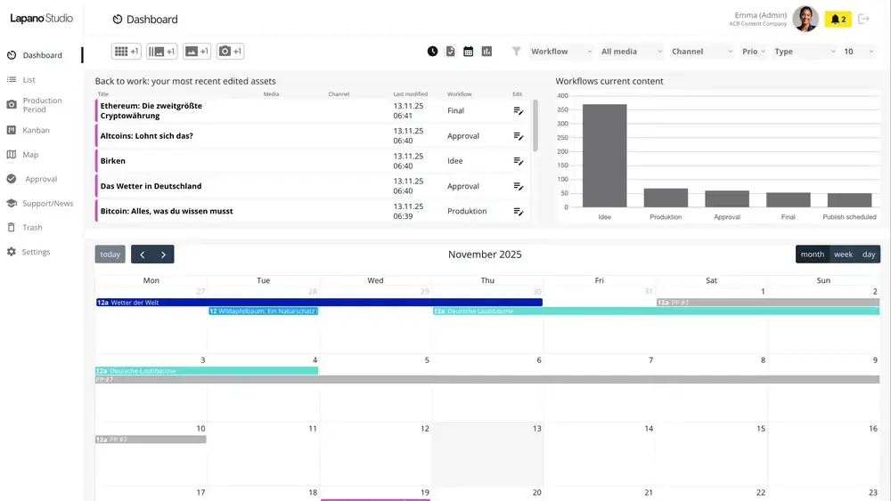 Für viele Unternehmen ist es eine Herausforderung, regelmäßig relevante Inhalte zu erstellen, um Kunden oder potenzielle Mitarbeiter anzusprechen. Das Lapano Studio systematisiert den Planungs- und Erstellungsprozess von Content. Das spart Zeit, Geld und Abstimmungsarbeit.